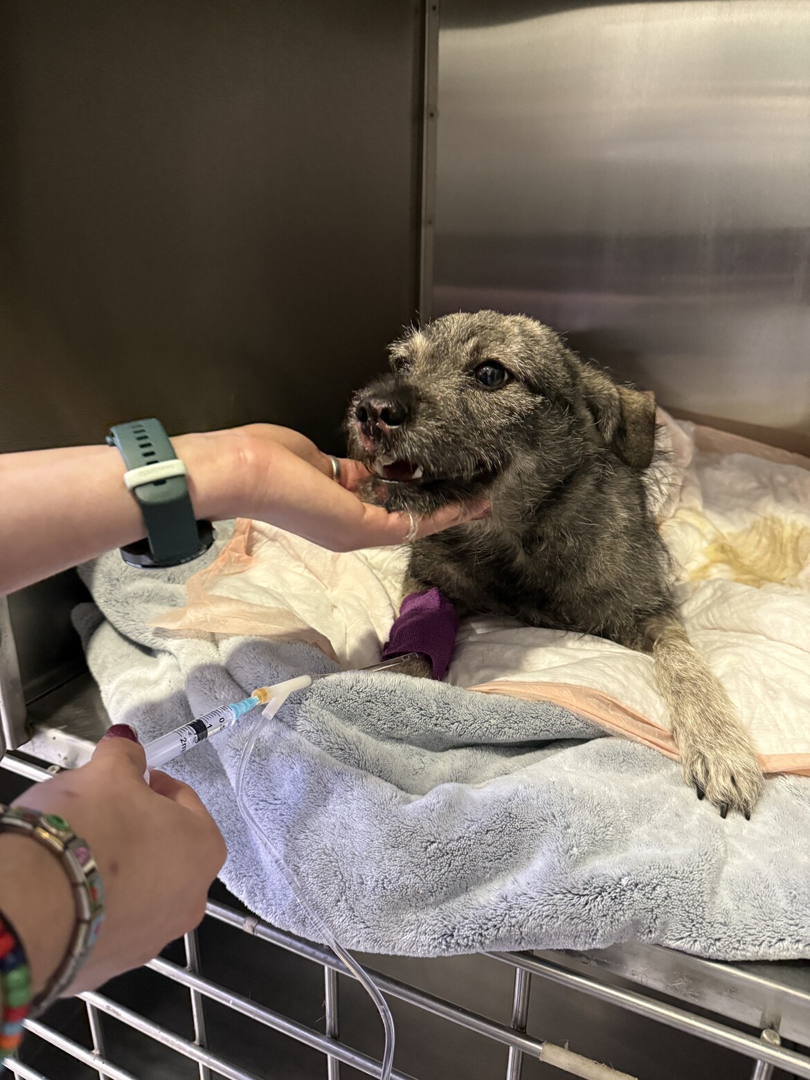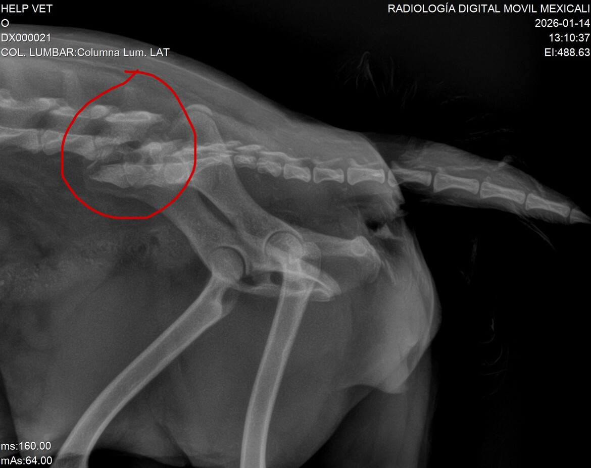 She was taken to HelpVet Veterinary Clinic in Mexicali, where the doctors immediately evaluated her, ruled out internal bleeding, and began treatment for pain and inflammation. X-rays confirmed a spinal fracture. Since then, she has been receiving medical care, and medications have been continuously prescribed and paid for as part of her stabilization.