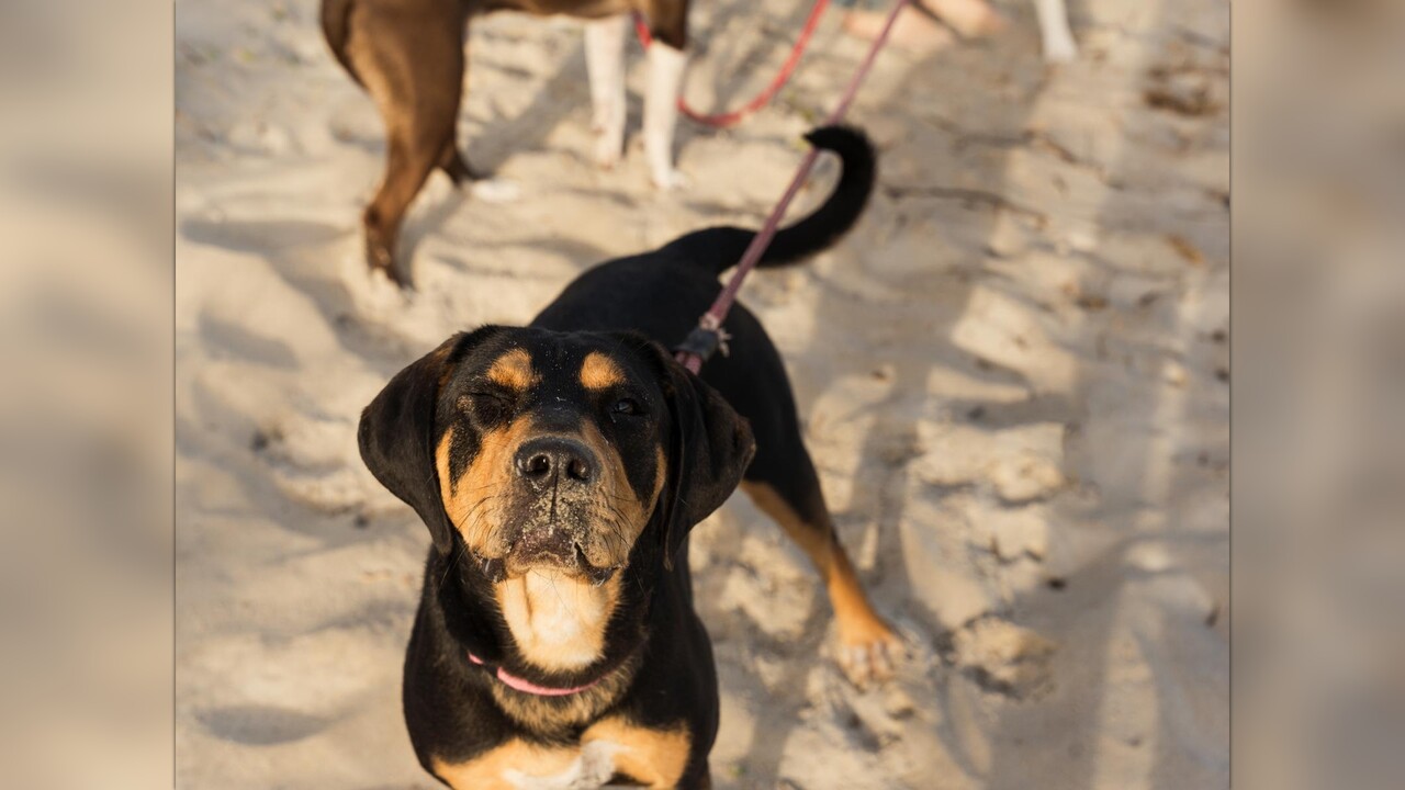 She does her best inside, but whenever she’s in bright light or outside, she can’t even keep her eye open. Despite her discomfort, she’s still her sweet, gentle self — always wagging her tail and trusting her people.