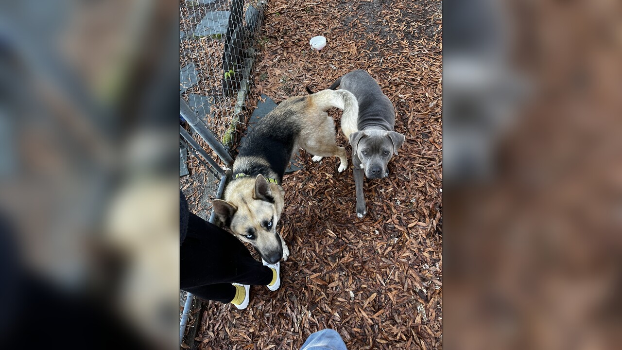 Lil’ Mama (a grey pit mix) and Big Papa (a blonde shepherd mix) were found wandering together in Battle Park. They were dirty, scraped up, and clearly had been trying to survive on their own for some time.